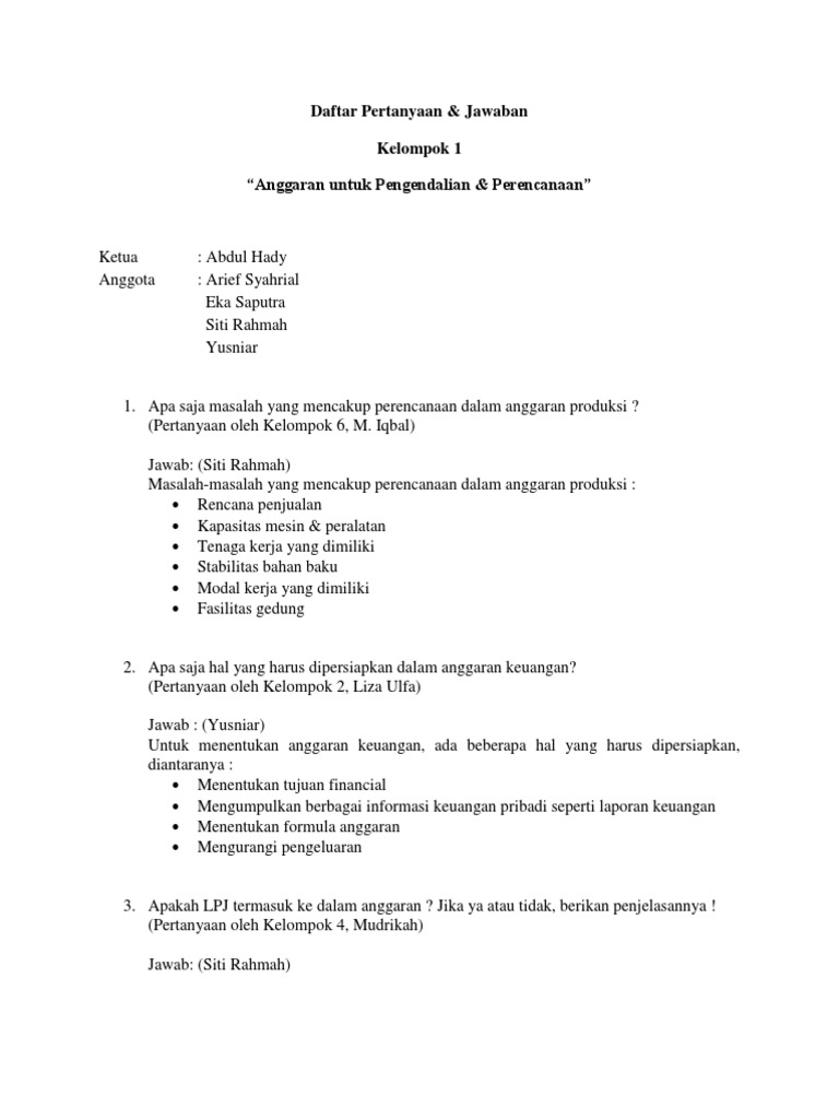 Daftar Pertanyaan Docx Daftar Pertanyaan Penganggaran Perusahaan Oleh Kelompok 4 Pawestri Wilujeng 43216110546 Alvida Dewi Amanda 43216110549 Yusuf Course Hero from www.coursehero.com Ajukan pertanyaan tentang tugas sekolahmu. Peraturan presiden (perpres) tentang rincian anggaran pendapatan dan belanja negara tahun anggaran 2020. Mengenal pasangan anda dengan lebih baik. Mau jadi lebih lancar bicara bahasa inggris? Jabatan fungsional analis anggaran adalah jabatan yang mempunyai ruang lingkup tugas, tanggung jawab, wewenang dan hak untuk melakukan. Sudah tahu bagaimana cara mengurus keuangan dan cara membuat anggaran rumah tangga pasangan baru menikah yang ideal? Lantas, muncul berbagai pertanyaan tentang asuransi yang ingin kamu tanyakan. Untuk melakukan segmentasi pasar ada beberapa pertanyaan yang harus anda jawab dan harus dilakukan agar setelah melakukan segmentasi pasar.